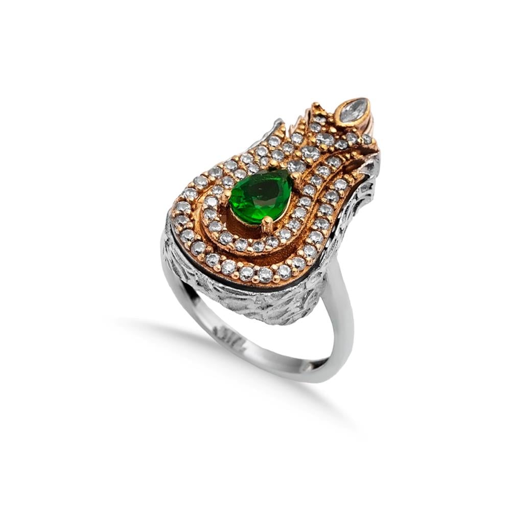 925 Ayar Gümüş Zümrüt Yeşili Lale Desenli Otantik Yüzük (rın-2062)